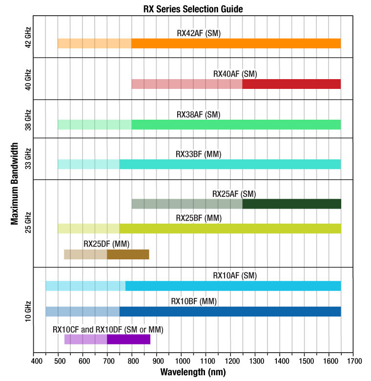 Figure 1.1  While each RX Series model is designed and intended for operation over the specified wavelength range shown by the solid colored regions, each will respond with reduced performance to optical inputs at shorter wavelengths, as shown by the partially transparent regions.