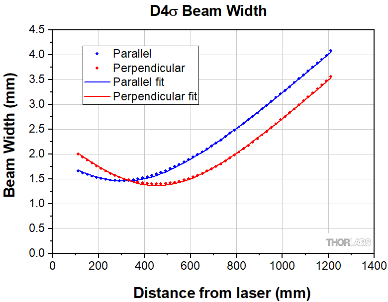 The specifications for the laser indicate that the typical parallel and perpendicular FWHM divergences are 40° and 60°, respectively. Therefore, as the light propagates, an elliptical beam will result. To collect as much light as possible during the collimation process, consider the larger of these two divergence angles in your calculations (in this case, 60°).