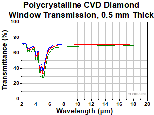 (posted 2024-02-02 09:32:16.0) Thank you for reaching out to us with this inquiry. This type of diamond has nominally a broadband transmission up to 100um and beyond, though we only really advertise it for up to 25um. Within this range the absorption of the material is relatively low (as you can see in the absorption coefficient graph) and most of the reduction in transmission comes from Fresnel reflections at each air-glass interface. Typical transmission for the low absorption coefficient regions (excluding the 2.5-7.5um region where large absorption occurs) will be approximately 70%. I have contacted you directly to discuss your particular wavelengths of interest. Gary Cook