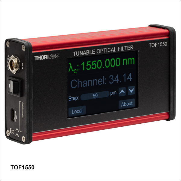 Thorlabs’ TOF1550 filter is a tunable Gaussian bandpass filter designed to operate with telecommunication C-band (1527 - 1567 nm) signals on a dense wavelength division multiplexing (DWDM) ITU grid. The center wavelength of the bandpass can be tuned to any position within the operating wavelength range by selecting either the wavelength directly or a channel on the ITU grid. If multiple DWDM channels are input into the filter, only the selected channel will be transmitted while all others will be blocked.