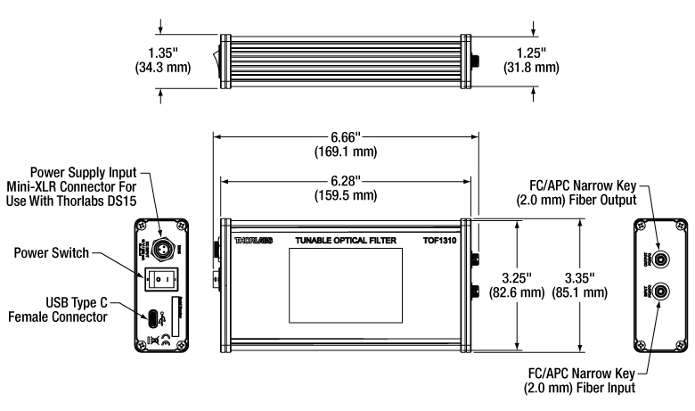 - FC/APC Narrow Key (2.0 mm) Fiber Input and Output