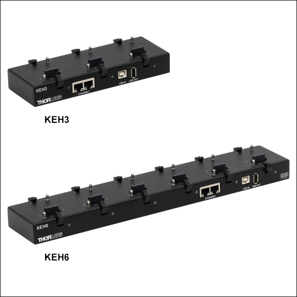 The KEH3 and KEH6 Controller Hubs contain a fully compliant USB 2.0 hub circuit and provide all communications and power distribution for up to three (Item # KEH3) or six (Item # KEH6) K-Cubes or T-Cubes (KAP101 or KAP102 adapters needed for T-Cubes), using only a single power connection. Additionally, the hubs have two Ethernet connection ports. The second Ethernet port or USB OUT port can be connected to the input on another Controller Hub to allow multiple Controller Hub connections while still only requiring a single Ethernet or USB cable from the host PC. The hubs draw a maximum current of 4.6 A; please verify that the cubes being used do not require a total current of more than 4.6 A. Note that the LEDD1B LED Driver does not include USB connectivity and cannot be controlled through the Kinesis® software.