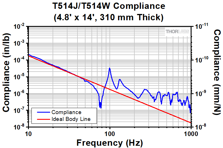 where Q is the amplification of the tables response to a vibrational source at a specific frequency (f) of the optic table. Q is calculated by dividing the compliance at the optical table resonance frequency by the theoretical compliance of an ideal rigid body. The maximum dynamic deflection coefficient is usually due to the response of the optical table at its first natural resonance frequency. Nexus® optical tables feature proprietary optimized damping mechanisms to limit the value of Q at the table's natural resonances.