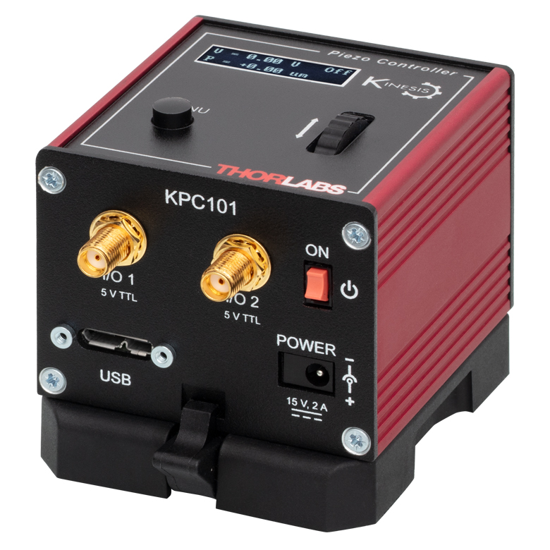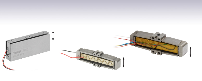 Thorlabs' Amplified Piezoelectric Actuators each consist of a discrete piezoelectric stack mounted inside a flexure housing. The flexure mount acts as a lever arm that amplifies the free stroke displacement of the stand-alone discrete stack. While the displacement achieved by this assembly is significantly larger than that of the piezo stack, the fast response times and low drive voltage ranges of the discrete stack are maintained. Because this displacement is created by a piezo stack within a flexure mount, these actuators do not suffer from backlash.