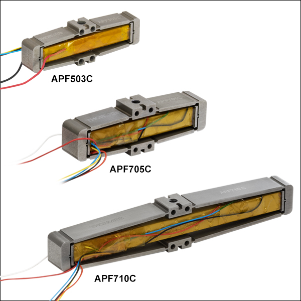 The APF series can be driven in both open-loop and closed-loop configurations using the following controllers: MDT69xB (open-loop), MPZ601 (closed-loop), BPC30x (closed-loop), or KPC101 (open- or closed-loop). With the closed-loop APFxxxC actuators, it is recommended that the AMP002 strain gauge pre-amp circuit be used to monitor and use the strain gauge signal to determine the actuator position in conjunction with a cloped-loop controller. The open-loop actuators can also be driven with the BPA100 amplifier which allows faster open-loop response with wider voltage and travel ranges. For additional guidance on integrating these piezoelectric devices into applications, special operational considerations, and data that will allow their lifetimes to be estimated when their operational conditions are known, please see the Operation tab and the APF Series manual. For more assistance with these and other configurations, please contact Tech Support.