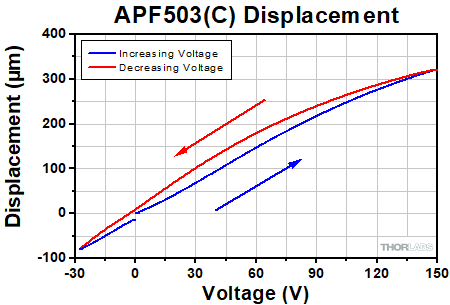 The displacement response of the APF503(C) amplified piezo actuator to applied voltage is plotted above. To view an Excel file that contains these data values, please click here.