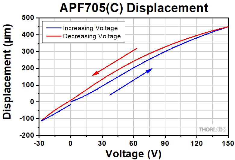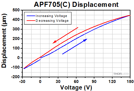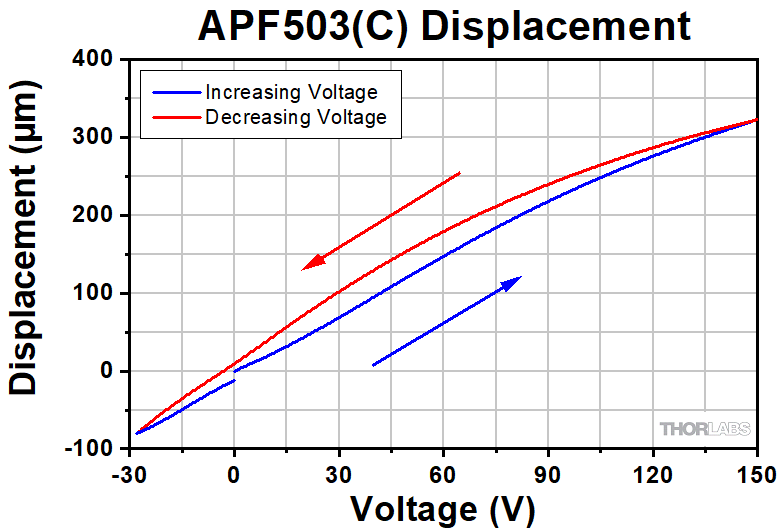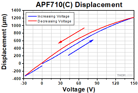 The displacement response of the APFH720 amplified piezo actuator to applied voltage is plotted above. The left graph shows a voltage cycle from 0 to 150 V, while the right graph shows a voltage cycle over the full -30 to 150 V range. To view an Excel file that contains these data values, please click here.