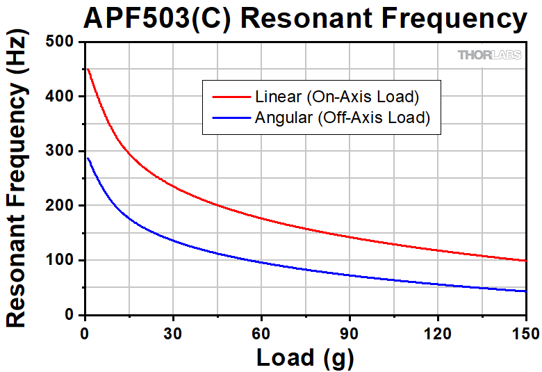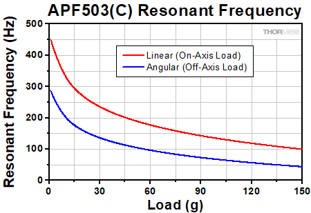 The resonant frequency of the APF503(C) amplified PZT actuator as a function of the applied load is plotted above. To view an Excel file that contains these data values, please click here.