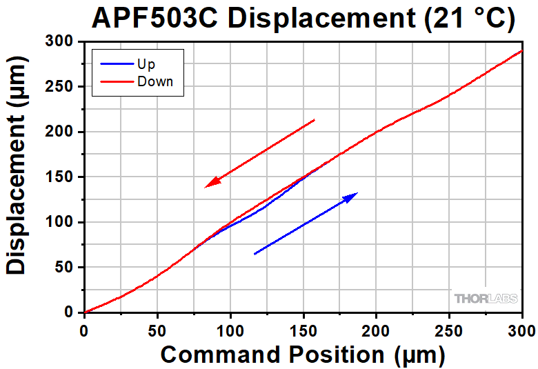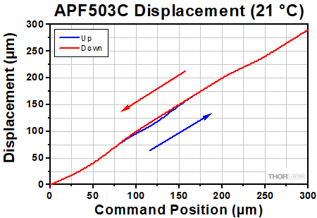 The displacement response of the APF503C closed-loop amplified piezo actuator to the command position is plotted above. To view an Excel file that contains these data values, please click here.