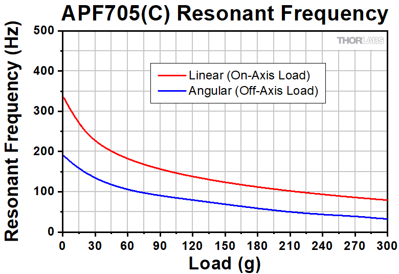 The resonant frequency of the APF705(C) amplified PZT actuator as a function of the applied load is plotted above. To view an Excel file that contains these data values, please click here.