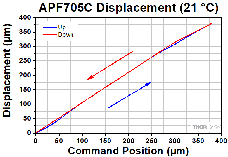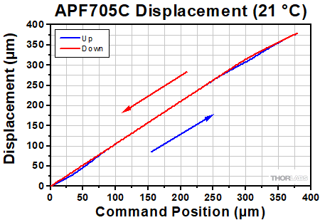 The displacement response of the APF705C closed-loop amplified piezo actuator to the command position is plotted above. To view an Excel file that contains these data values, please click here.