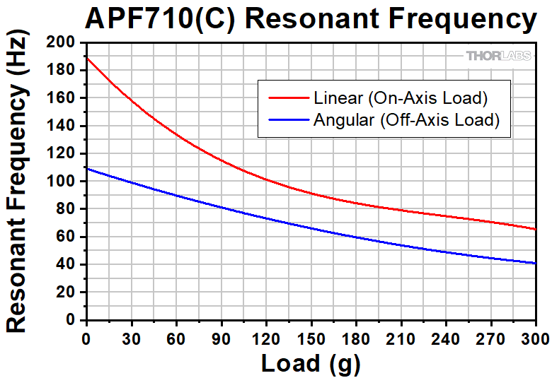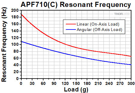 The resonant frequency of the APF710(C) amplified PZT actuator as a function of the applied load is plotted above. To view an Excel file that contains these data values, please click here.