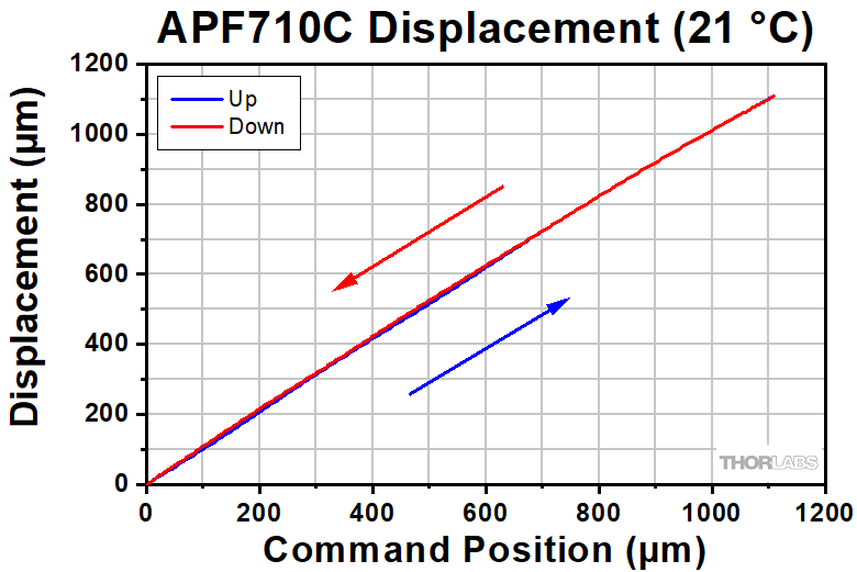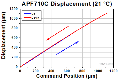 The displacement response of the APF710C closed-loop amplified piezo actuator to the command position is plotted above. To view an Excel file that contains these data values, please click here.